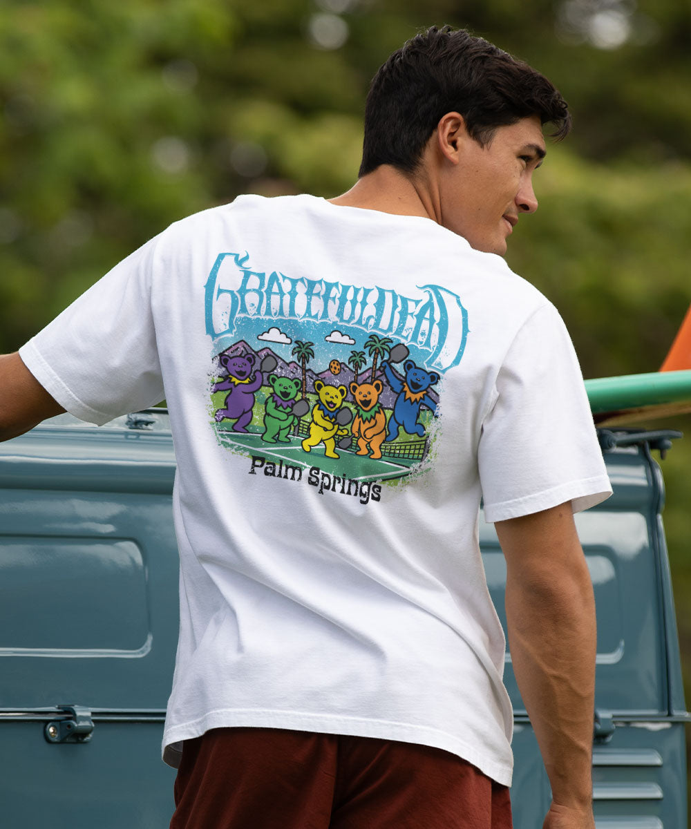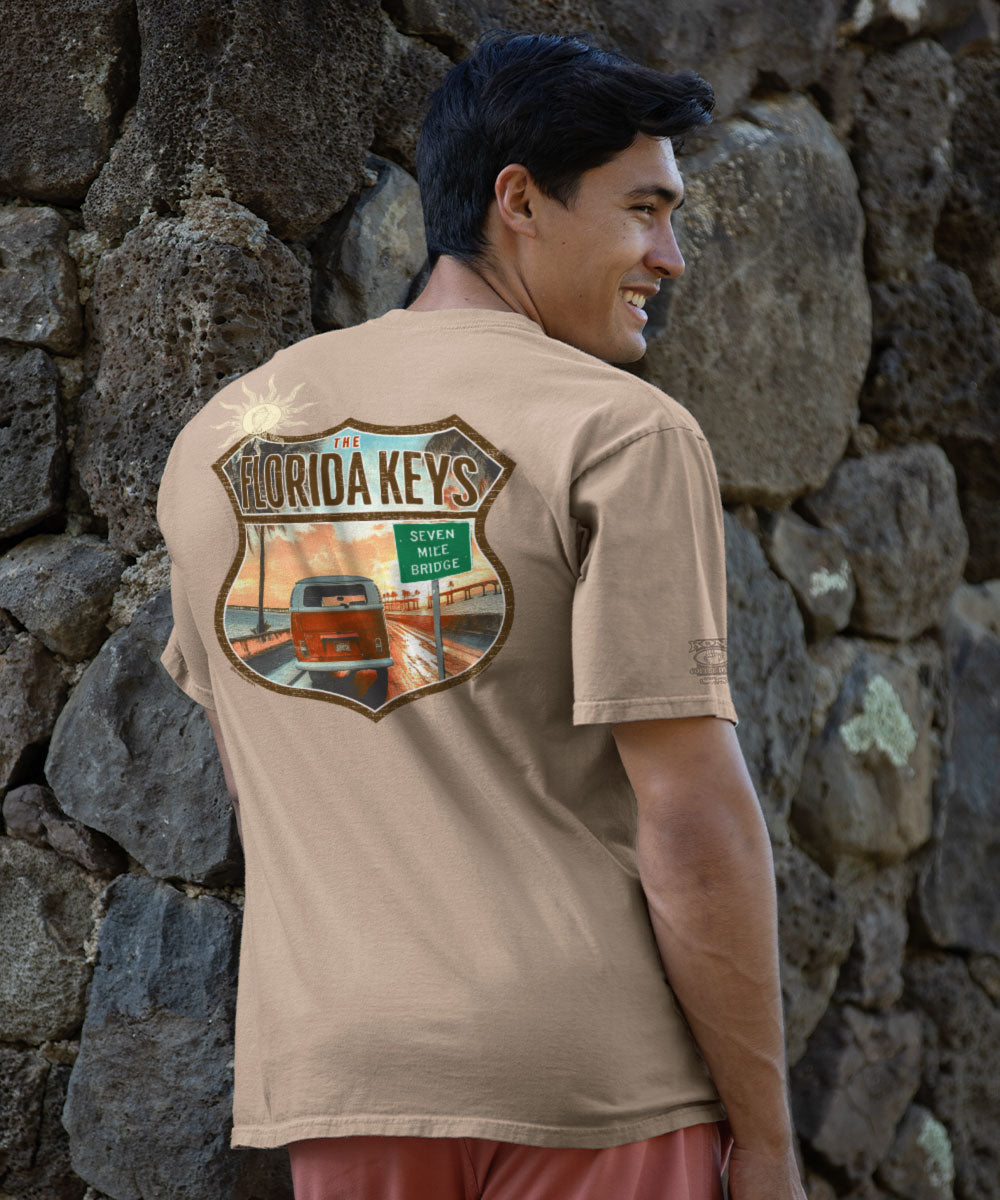 Man wearing a tan shirt with a tribal turtle design putting surfboards onto a car