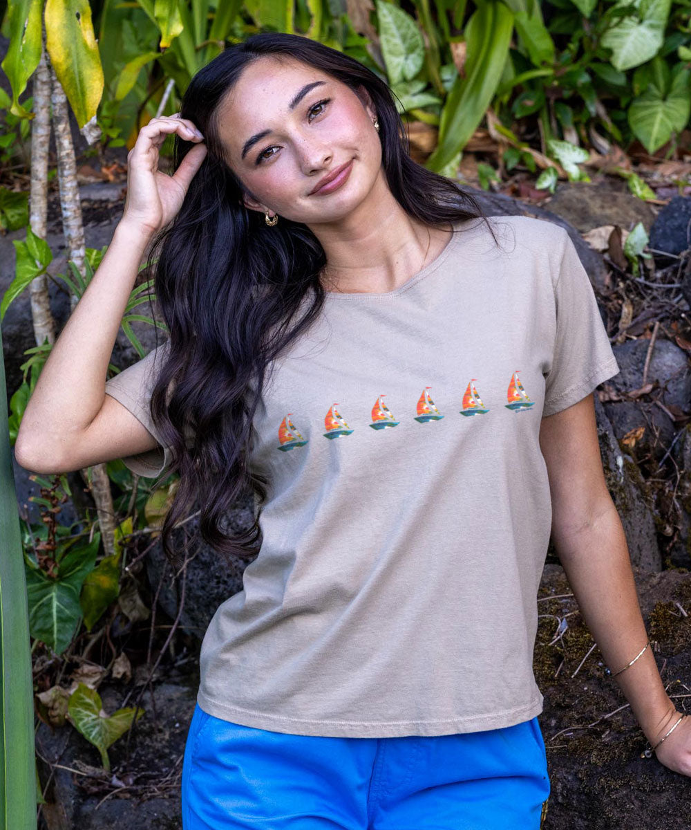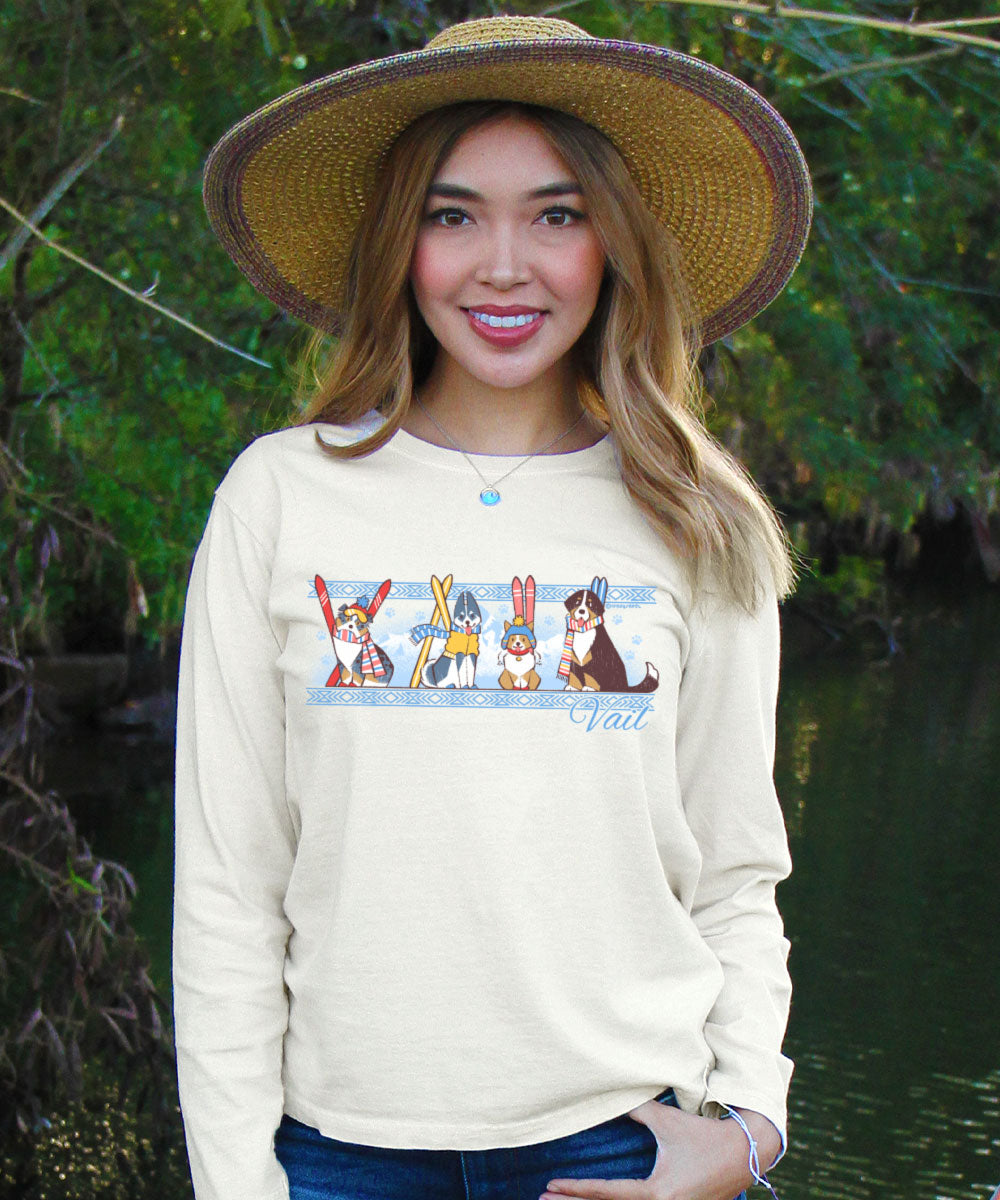 Woman standing next to a blue vehicle with a floral pattern on a blurred natural background