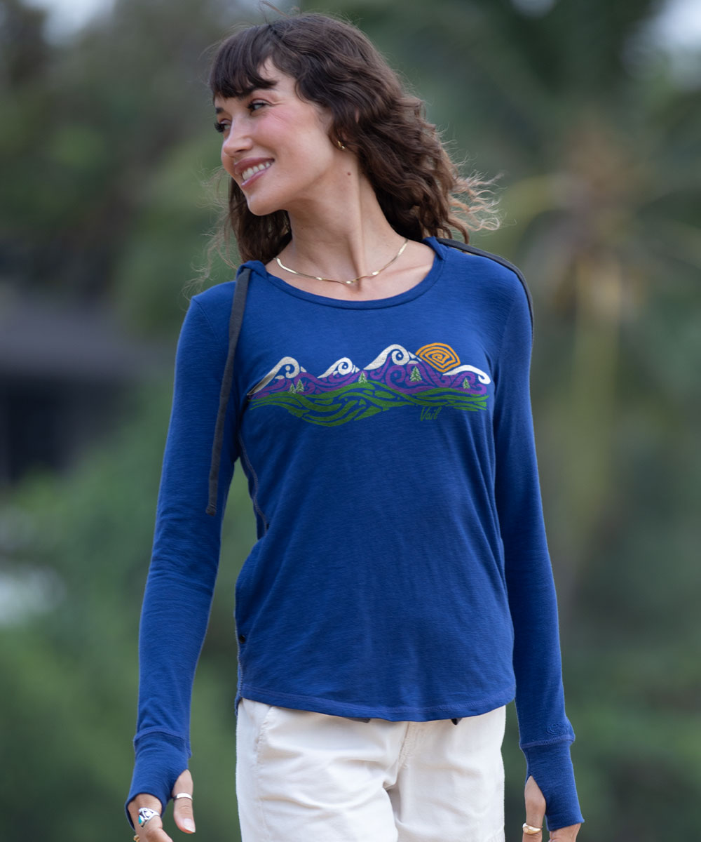 Woman standing outside wearing a navy long sleeve shirt with a whale print on the front