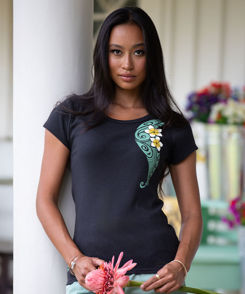Woman standing outside holding the handlebars of a bike wearing  a black v-neck tee with a floral design on the front
